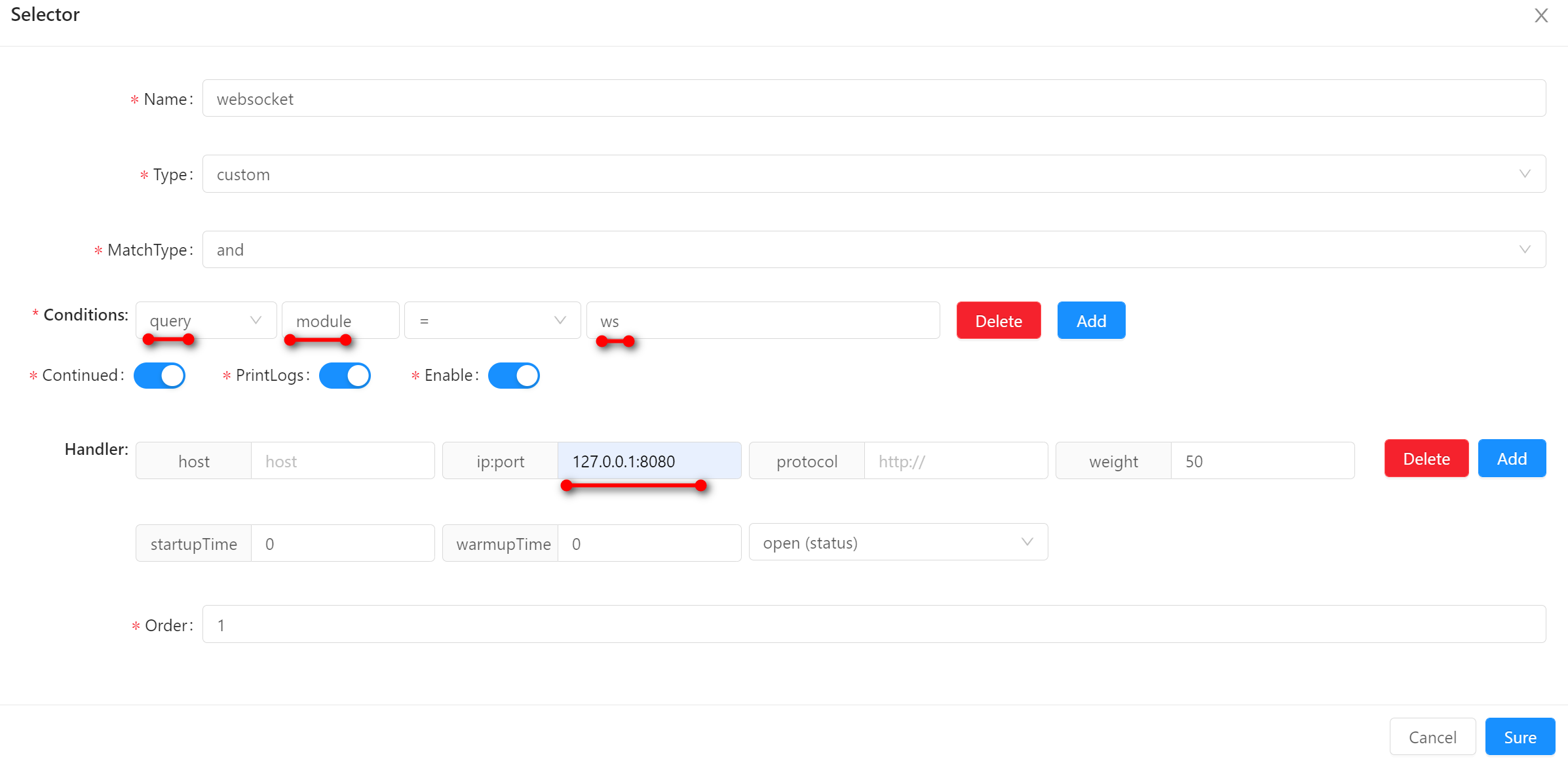 Select the type query in the condition, and fill in the matching field and value, which are method and /websocket respectively. You can also customize the fields and the values, as long as they match the request.