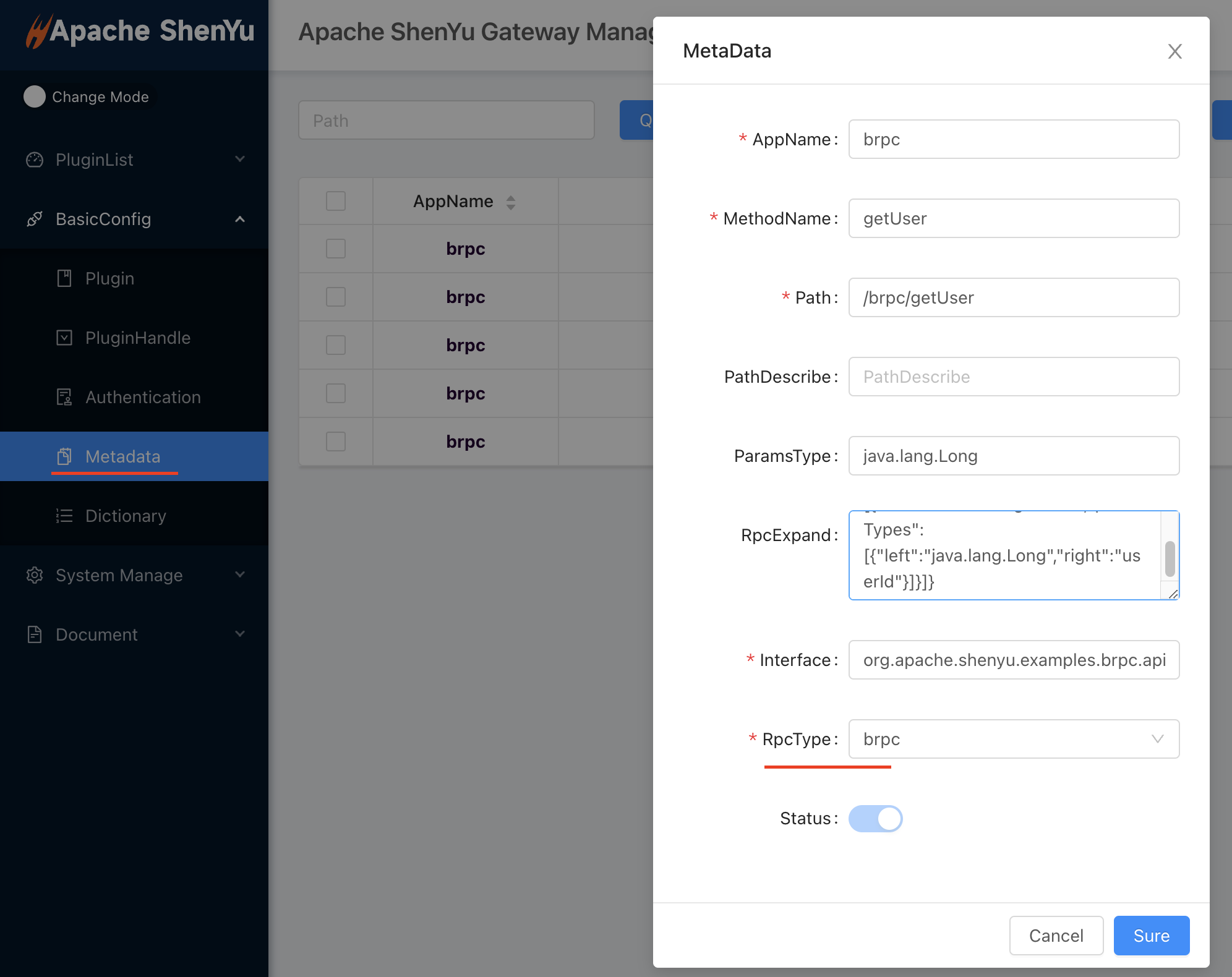 Each Brpc interface method, will correspond to a metadata, when the Brpc application client access to the Apache ShenYu gateway, will be automatically registered, can be viewed in the shenyu-admin background management system of the BasicConfig --> Metadata management.