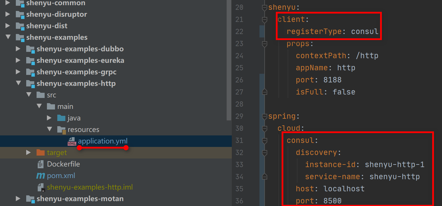 下面展示的是http服务作为客户端接入到Apache ShenYu网关时,通过Consul方式注册配置信息。其他客户端接入时(Dubbo、 Spring Cloud等),配置方式同理。